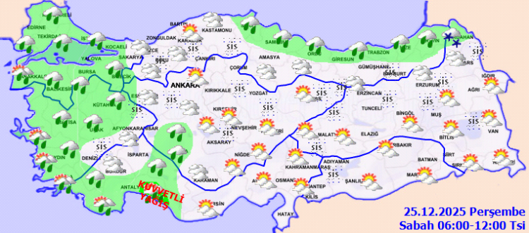 ANKARA (İGFA) – Meteoroloji Genel Müdürlüğü, 25 Aralık Perşembe gününe ilişkin hava tahmin raporunu yayımladı.